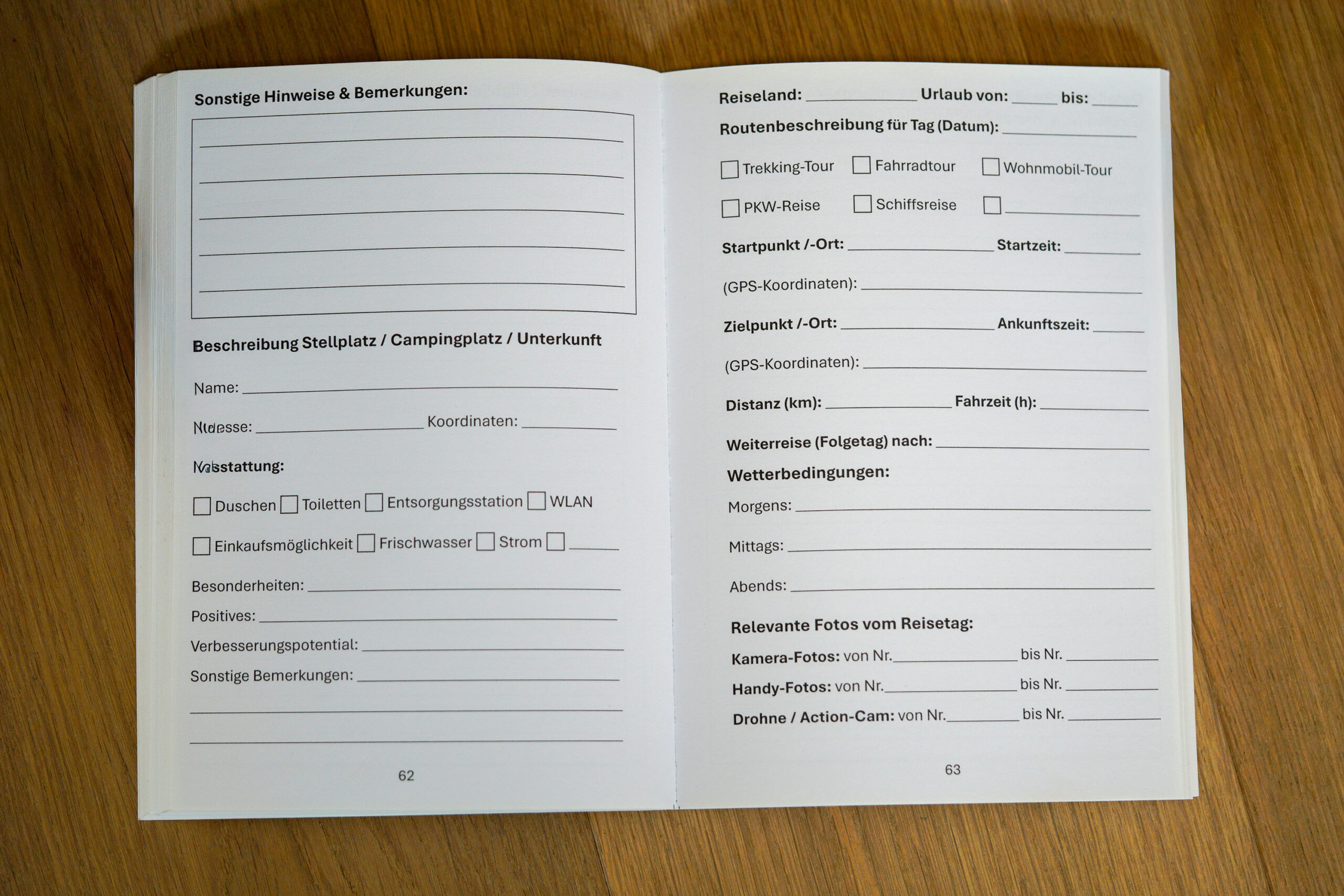 “Dieses Reise-Logbuch wird dir helfen alle wichtigen Informationen, deine Erfahrungen sowie persönliche Eindrücke der Reise festzuhalten. Das Logbuch ist für eine 4-wöchige Reise ausgelegt, für jeden Reisetag stehen dir vier Seiten zur Verfügung, somit hast du genügend Platz für deine Erlebnisse.
